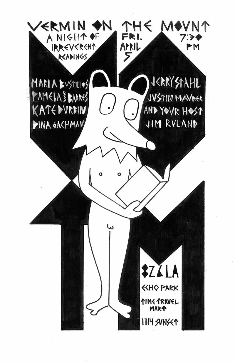 I’m reading this Friday evening at the Vermin On the Mount Reading Series hosted by Jim Ruland. A very exciting final lineup has been announced including super groupie Pamela Des Barres and author/screenwriter Jerry Stahl.
