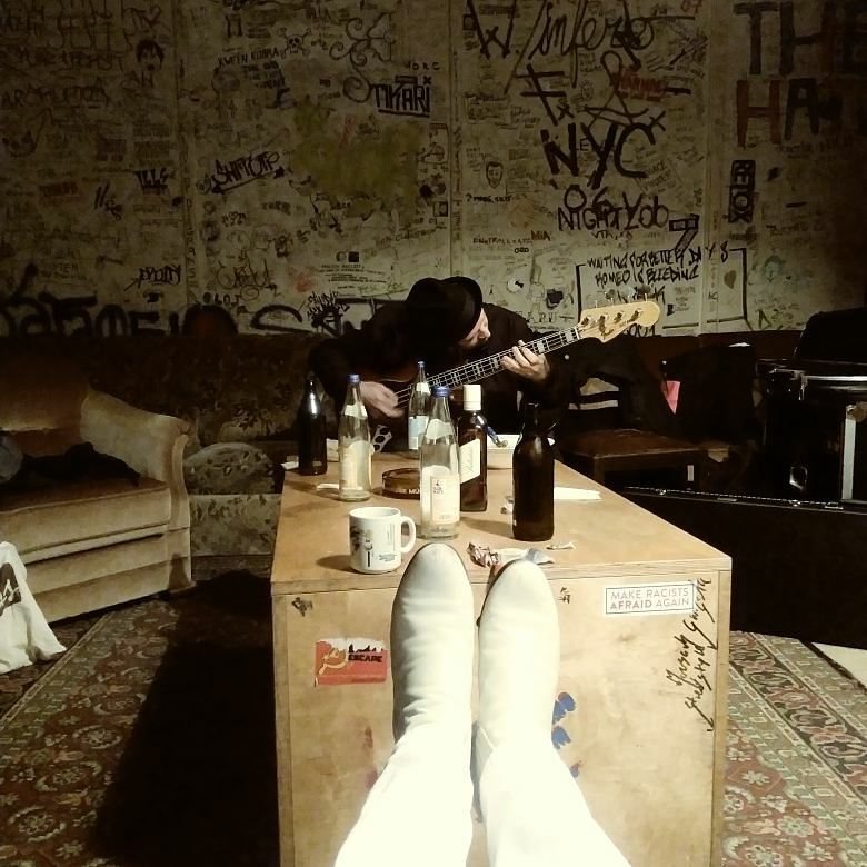 Andru warming up on bass in the Kafe Kult band room