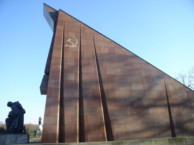 Soldier, statue, and banner at the Soviet War memorial in Treptower Park. Berlin. Photo Credit: JoeP