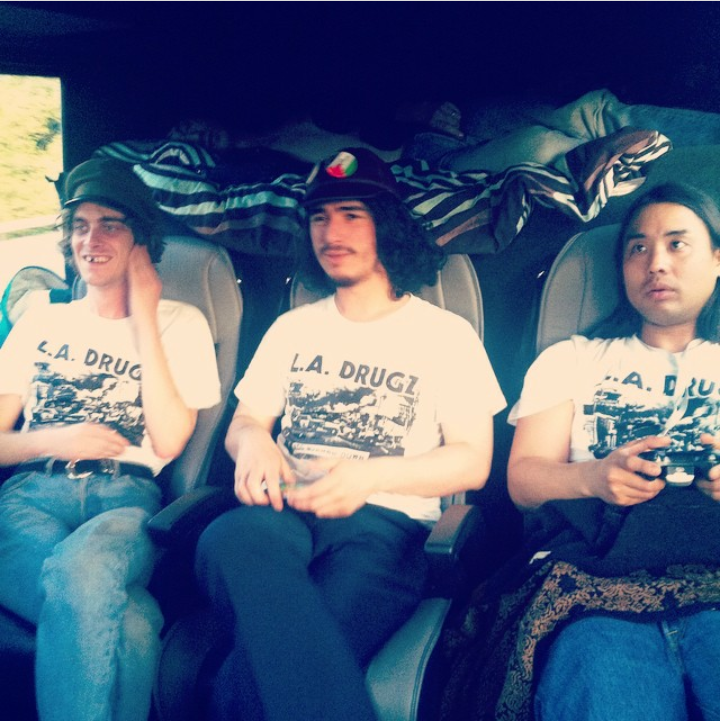 Fat White Family on the first date of their UK tour, the only clothing not stolen out of their suitcases in SF being their matching LA Drugz T-shirts. Photo by Polly Braithwaite.